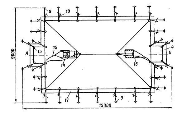 Отыскать на наружном намёте обметанные отверстия для угловых стоек; удерживая наружный намёт за эти отверстия, хорошо растянуть его во все стороны; растянутый наружный намёт обозначит расположение стенок, палатки и места, где будут стоять стойки.