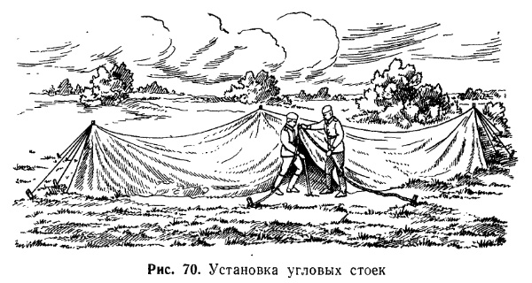 Привязать наружный намёт завязками к нижним концам стоек; поправить, где нужно, расположение всех стоек и кольев, прочно забить колья и натянуть растяжки; правильно установленная палатка должна быть хорошо, ровно, без складок растянута во всех частях, стойки ее должны стоять прямо и выровненными в линию.