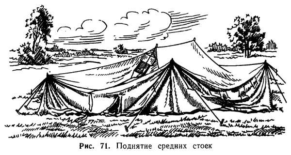 Поднять и поставить на свои места средние стойки палатки (рис.71); в зависимости от ситуации для поднятия каждой стойки требуется от 2-х до 3-х человека; они забираются к стойкам под намёты и одновременно поднимают обе стойки.